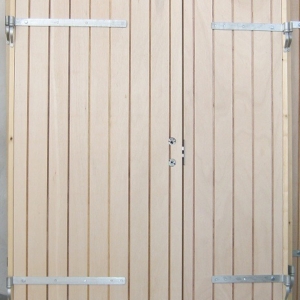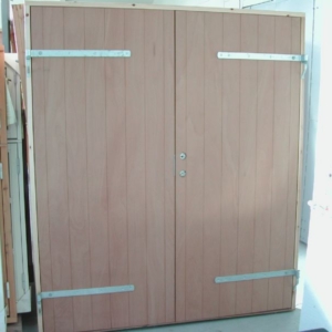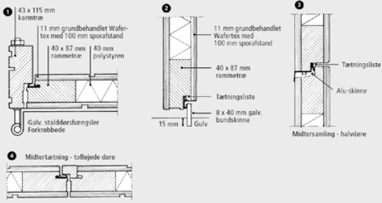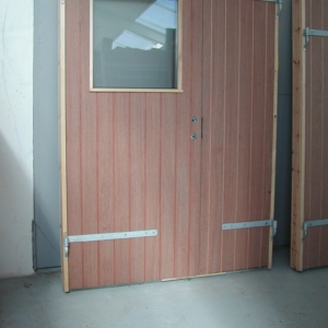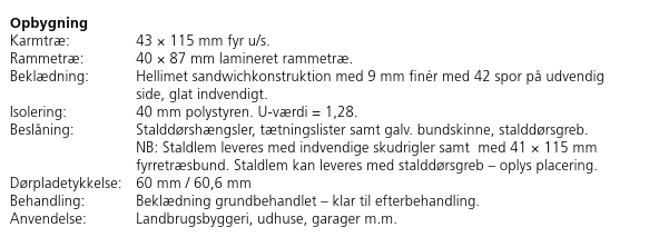 Døren er konstrueret som en hellimet sandwichkonstruktion. Isoleret med 40 mm polystyren og med 9 mm finér med 4” lodrette spor på udvendig side, glat indvendigt. Beslåning kan være traditionelle nokhængsler eller dørhængsler efter ønske.
